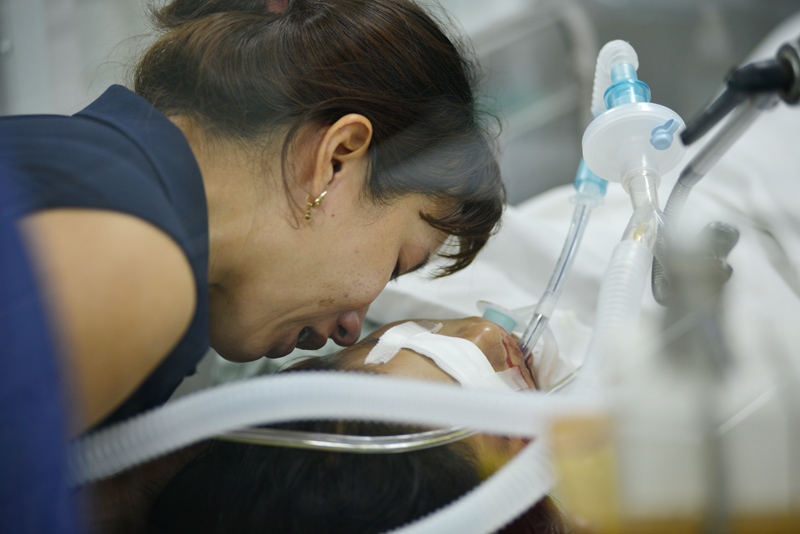 Vợ trân người khóc lặng bên chồng bị TNGT nghiêm trọng.
