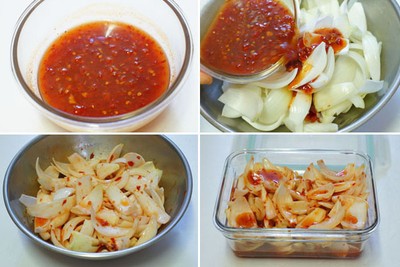 Cho tất cả nguyên liệu: tương ớt xào, nước giấm, đường vào trong chén trộn đều, đổ hỗn hợp gia vị vào bát hành đã cắt rồi trộn đều. Sau đó, cho hành tây đã trộn gia vị vào trong chiếc khay đậy nắp lại đặt vào trong ngăn mát tủ lạnh để 2 giờ là có thể dùng được.