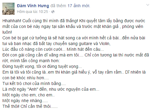 Trên trang cá nhân của ḿnh, Đàm Vĩnh Hưng cũng đă chia sẻ: “Cuối cùng th́ ḿnh đă thắng! Khi quyết tâm lấy bằng được nước mắt của con bé này ngay tại sân khấu và trước mặt khán giả, phóng viên luôn. Con bé bị gạt cứ tưởng là sẽ hát song ca với ḿnh hết cả bài... đến nửa bài tui và ban nhạc đă bắt tay chuyển sang guitar và violin. Lúc đầu cô nàng c̣n cười cười, ḿnh hát đến câu: Đời con gái cũng cần dĩ văng mà em tôi. Chỉ c̣n tương lai th́ nước mắt đă rớt, ḿnh tấn công mạnh hơn: Đừng tuyệt vọng, tôi ơi đừng tuyệt vọng... Em là tôi và tôi cũng là em th́ khán giả hiểu ư, vỗ tay rầm rầm. Dĩ nhiên là con bé khóc nhiều hơn. Tôi kết tṛ chơi của ḿnh bằng: … Là một ngày anh đến, nhu ước nguyện của em. Một ngày cho em, cho em. Một ngày nhẹ nhàng. Thế thôi! Chỉ cần thế thôi…”.