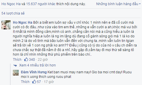 Phía dưới phần b́nh luận, Hồ Ngọc Hà cũng đă b́nh luận về những chia sẻ của Đàm Vĩnh Hưng dành cho ḿnh: “Bởi anh biết em luôn sợ xấu và chỉ khóc 1 ḿnh nên em đă cố cười mà cười có được đâu, như cứa vào tim em thế. Nhưng em vẫn cười anh à, khóc mà vui bởi ít nhất là ḿnh đồng cảm, ḿnh có anh. Chẳng cần nói mà anh cũng hiểu. Anh luôn là người nghĩa hiệp, em luôn là người im lặng dù đang cố gánh sóng gió mà 1 là không do ḿnh 2 là do vô t́nh mà băo luôn vẫn đến với chúng ta. Ḿnh vẫn luôn tin thời gian sẽ trả lời về 1 con người phải không anh? Điều ǵ cũng có lư do của nó và câu chuyện diễn ra chưa chắc sự thật đă nằm ở đó anh nhỉ. Hăy gặp đi, cầm tay đi mọi thứ sẽ sáng tỏ hơn là chỉ nh́n những thứ phù phiếm trên báo chí”.