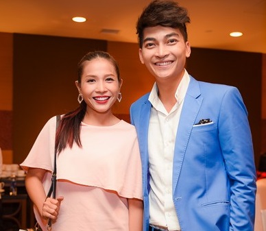 Khương Ngọc bế bổng Thủy Top trước khi buổi họp báo bắt đầu. Cô không ngại bạn gái Khương Ngọc ghen vì rất thân thiết với Khả Như.
