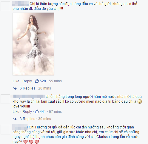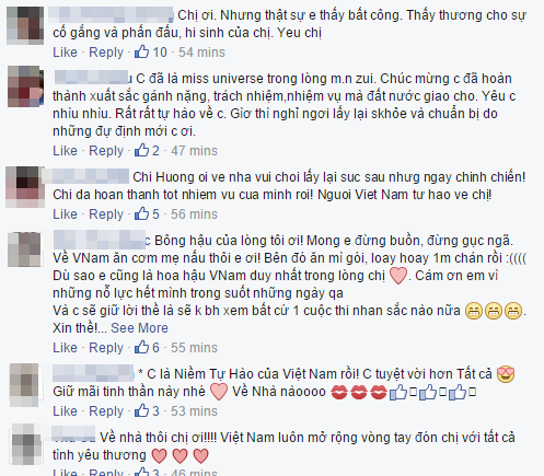 "Vậy là mọi thứ đã thật nhẹ nhàng rồi...Hương vẫn luôn hạnh phúc và tự hào về tất cả nhưng cố gắng của mình..Hương không buồn hay thất vọng gì đâu cả nhà nhé... Vì Hương đã trưởng thành lên rất nhiều rồi ..Tất cả các bạn thí sinh yêu mến Hương và công nhận nhan sắc của Việt Nam chúng ta..Điều đó làm Hương vô cùng tự hào...Chúng ta hãy vẫn luôn văn minh nhé cả nhà..Và đừng bao giờ từ bỏ niềm tin..Hương được đi ăn đồ ăn Việt Nam rồi và sẽ xứng đáng dành được nhiều thời gian cho bản thân mình hơn.