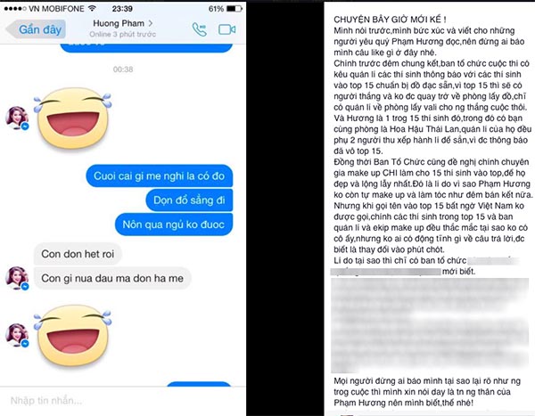 Mọi người đừng ai bảo mình tại sao lại rõ như người trong cuộc thì mình xin nói đây là tin nhắn người thân của Phạm Hương nên mình biết”.