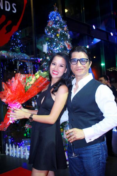 Nam diễn viên ân cần chăm sóc Bebe Phạm trong buổi tiệc.