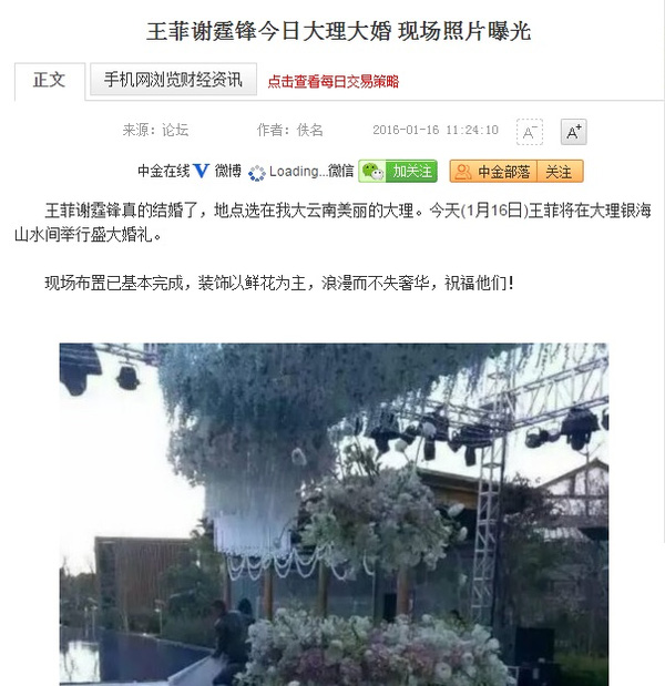 Theo trang 163, tối ngày 15/1 có một người dùng mạng đã tung loạt hình ảnh được cho là "Vương Phi tổ chức đám cưới cùng Tạ Đình Phong tại Đại Lý (Vân Nam)".