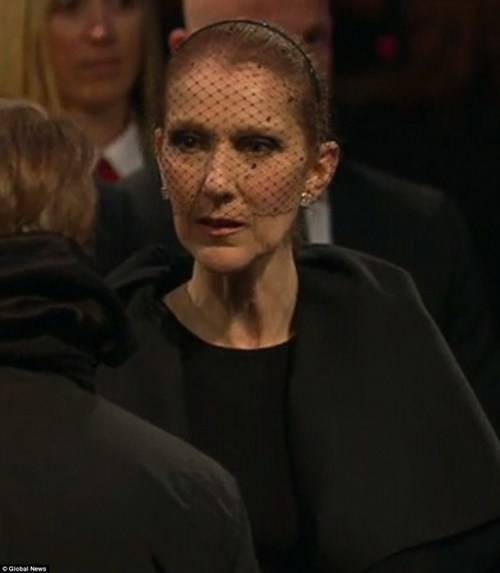 Celine mặc trang phục màu đen, tóc búi gọn và đeo mạng trong đám tang của chồng. Nữ danh ca gầy rộc khi phải gánh chịu nỗi đau mất người bạn đời.