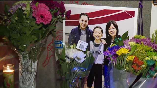 Hình Aaron Nguyễn cùng cha mẹ được thấy tại bức tường tưởng niệm bên ngoài trường trung học Toby Johnson Middle School. (Fox 40)