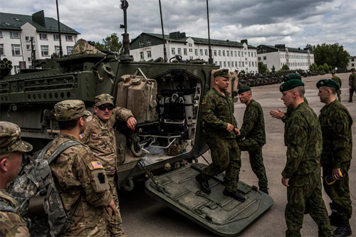 LínhLithuania kiểm tra một xe Stryker của quân đội Mỹ trong một cuộc tập trận năm ngoái. Lithuania và các nước láng giềng ơ Baltic, Estonia và Latvia, nằm trong số những nước NATO đang yêu cầu Mỹ hỗ trợ quân sự. (Ảnh: NY Times)
