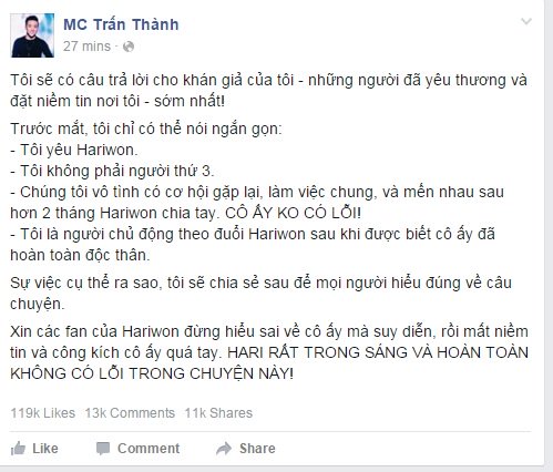 Nửa đêm 3.2, nam MC Trấn Thành chính thức đăng đàn trên trang cá nhân khẳng định, mối tình giữa anh với Hari Won là có thật. Theo đó, anh thừa nhận mình yêu Hari Won và không phải là kẻ thứ 3 chen vào khiến tình yêu 9 năm của Hari và Tiến Đạt phải tan vỡ.