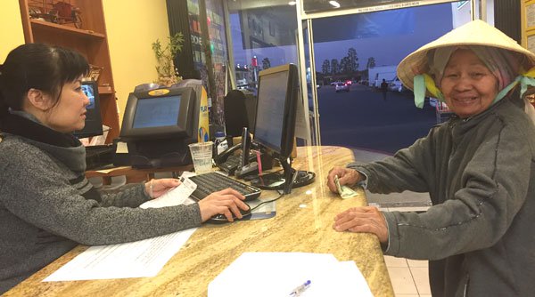Trang Nguyễn nói thêm: “Nhiều bác lớn tuổi phải len lén con cháu đi gửi tiền, vì sợ con la. Có bác còn hối: 'Cô làm lẹ lẹ giùm tôi, con tôi sắp đi chợ ra.' Có cô kia đi gửi tiền kể, cô xài $10 còn không dám xài, nhưng cho người thân ở Việt Nam thì bao nhiêu cũng không tiếc. Rồi có nhiều người đi xe lăn nhưng vẫn đều đặn hàng tháng mang tiền gửi về Việt Nam. Khách gửi đông nhất là vào cuối tuần, một ngày có từ 100 đến 200 khách. Ðặc biệt vào những ngày đầu tháng, nhiều bác nhận được ‘tiền già’ xong là ra đây gửi liền.”