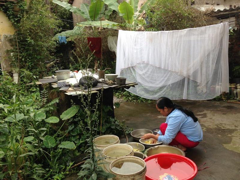 Một người phụ nữ đang lúi húi làm cơm bên cạnh bể nước. Chị ngoài bốn mươi, gương mặt hiền lành, người chắc nịch như chiếc chày giã cua.