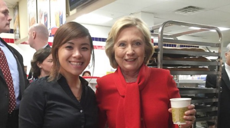 Bà Clinton và một nữ nhân viên trong tiệm, cô Stephanie Ly. Bà Clinton nói với người quản lý tiệm rằng bà thích cà phê ở đây. (Hình: Benito Tseng cung cấp)
