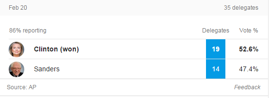 Đây là thắng lợi rõ rệt nhất của bà Clinton trước đối thủ Sanders kể từ khi các vòng bầu cử sơ bộ khởi tranh. Tại Iowa, bà Clinton chỉ thắng sát nút (49,9% so với 49,6%, hơn 2 đại biểu); sau đó thua toàn diện tại New Hampshire (38% so với 60%, kém 6 đại biểu).