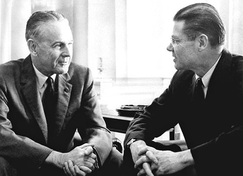 Đại sứ Maxwell D. Taylor (trái) nói chuyện với Bộ trưởng Quốc phòng Robert McNamara tại Lầu Năm góc ngày 27/11/1964, ngay khi vừa trở về từ Việt Nam