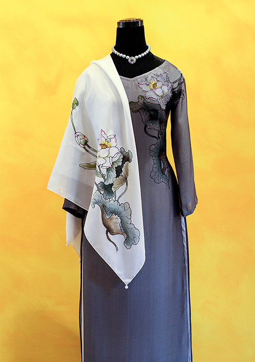 Bộ áo dài lụa màu xám bạc với họa tiết cành hoa sen được thể hiện bằng nghệ thuật vẽ tay trên vải là món quà dành tặng phu nhân Michelle Obama.