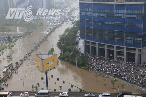 Dưới chân toàn nhà Keangnam là mênh mông biển nước, người Hà Nội loay hoay không biết làm thế nào để vượt qua điểm đen ngập úng này.