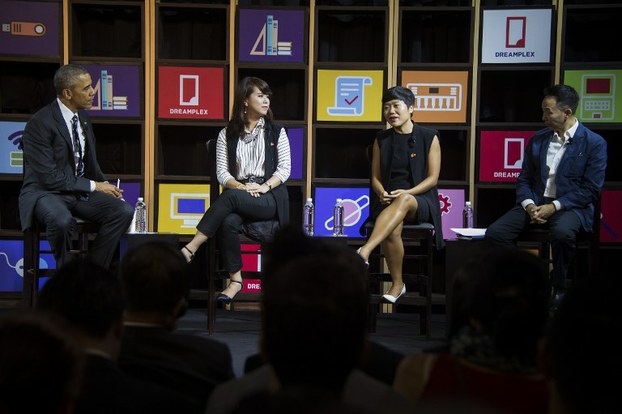 Tổng thống Mỹ Barack Obama (trái) nói chuyện với các doanh nhân tại DreamPlex, thành phố Hồ Chí Minh vào ngày 24 tháng 5 năm 2016.