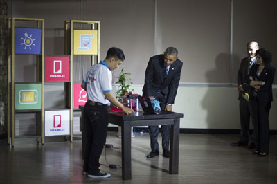 Tổng thống Mỹ Barack Obama (giữa) xem một triển lãm nhỏ về du lịch tại DreamPlex tại thành phố Hồ Chí Minh vào ngày 24 tháng 5 năm 2016. AFP photo