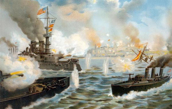 Giao tranh đầu tiên diễn ra ngày 1.5 ở vịnh Manila, Philippines. Hạm đội người châu Á của Phó đề đốc George Dewey nhanh chóng đánh bại hạm đội và hệ thống phòng thủ trên bờ biển của Tây Ban Nha, bao vây toàn bộ quần đảo này. Tháng 7.1898, bộ binh Mỹ đặt chân lên Philippines, thuộc địa của Tây Ban Nha. Chính quyền Tây Ban Nha kiểm soát đảo quốc này nhanh chóng đầu hàng.