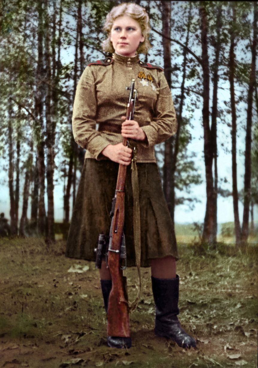 Khoảng 800.000 phụ nữ đã phục vụ trong Lực lượng Vũ trang Liên Xô thời đó với các nhiệm vụ như lính bắn tỉa, phi công, người bắn súng máy và rất nhiều người làm việc trong các đơn vị chăm sóc y tế.