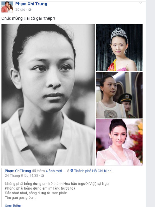 Nhiều người cho rằng, nghệ sĩ hơi quá khi gọi Phương Nga là cô gái "thép". Trước đó, NS Chí Trung còn viết thơ ca ngợi thần thái của Hoa hậu Phương Nga cũng khiến cho dân mạng xôn xao một phen.