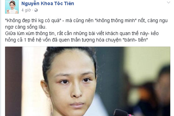 Ngay khi Phương Nga được tại ngoại trong không khí chúc mừng của nhiều người, Tóc Tiên đã bày tỏ: "Không đẹp thì không có quà" mà cũng nên "không thông minh" nốt, càng ngu ngơ càng sống lâu. Giữa lùm xùm thông tin, rất cần những bài viết khách quan thế này, kẻo hỏng cả một thế hệ vốn đã quen thần tượng hóa chuyện "bánh - tiền"".