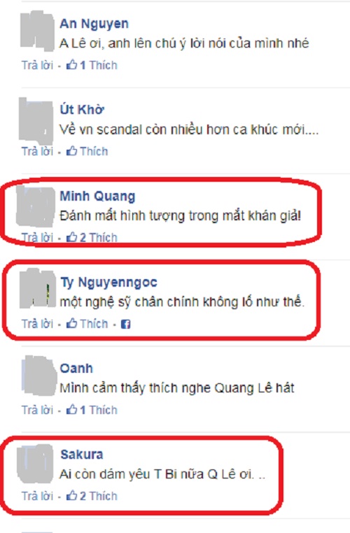 "Anh Lê ơi, anh nên chú ý lời nói của mình nhé", "Thật thất vọng! Mất hình tượng sau phát ngôn của Quang Lê", "Ai còn dám yêu Thanh Bi nữa", "Đánh mất hình tượng của mình trong mắt khán giả"...là một trong số rất nhiều những chia sẻ của fan gửi đến Quang Lê sau phát ngôn này.