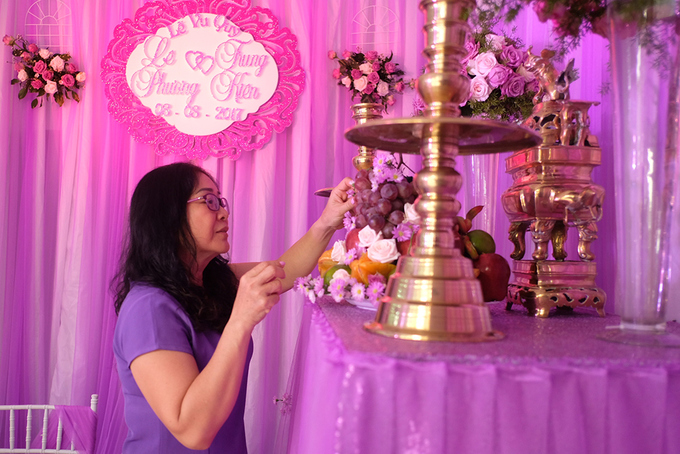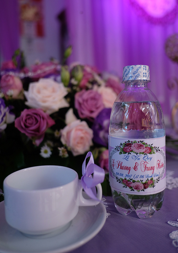 Gia đình diễn viên chuẩn bị kỹ lưỡng từng chi tiết nhỏ như chiếc nơ tím đính trên quai ly hay bình nước in thông tin buổi lễ.