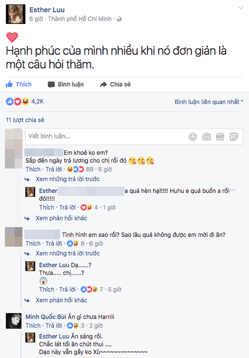 Ngay lập tức, nam ca sĩ Vũ Hà bất ngờ để lại bình luận khá thẳng và sốc: "Khoẻ không em, chồng em dạo này còn bỏ rơi em nữa không?". Hari Won đáp lại đầy tủi thân và hài hước rằng, đăng hẳn status rồi mà vẫn không thấy chồng xuất hiện, chắc Trấn Thành đang bận hỏi thăm người khác. Không biết nam danh hài kiêm MC có toát mồ hôi không khi vợ lại nói như thế.