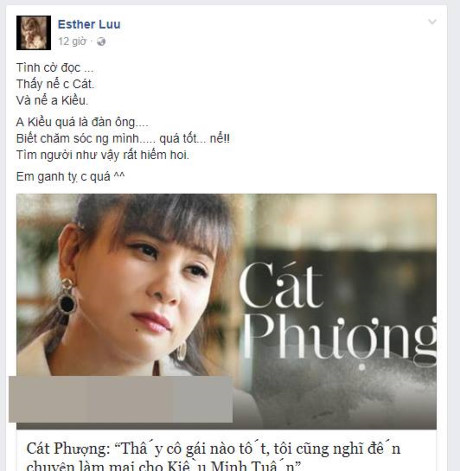 Cũng mới đây, Hari Won còn bày tỏ ngưỡng mộ cũng như sự 'ghen tị' về tình yêu của Cát Phượng và Kiều Minh Tuấn. Khi nghe Cát Phượng chia sẻ: "Thấy cô gái nào tốt, tôi cũng nghĩ đến chuyện làm mai cho Kiều Minh Tuấn", Hari Won không kìm được mà phải thốt lên: "Nể chị Cát. Và nể anh Kiều. Anh Kiều quá là đàn ông, biết chăm sóc người mình yêu quá tốt. Tìm được người như vậy rất hiếm hoi" Hari Won không những ghen tị với Cát Phượng mà cô nàng còn không tiếc lời khen ngợi Kiều Minh Tuấn.