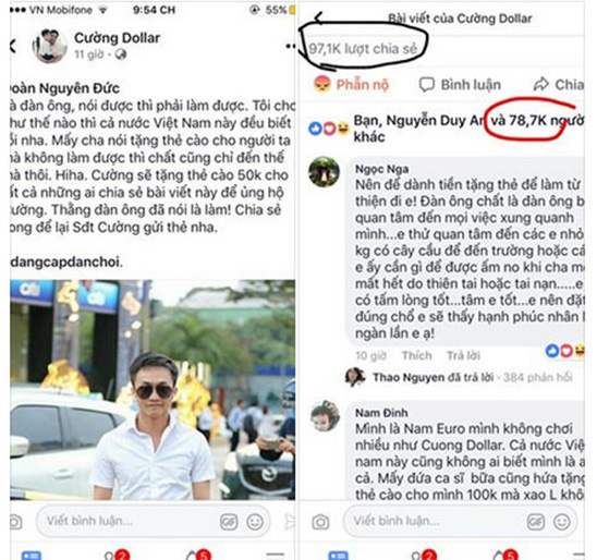 Chỉ trong một thời gian rất ngắn, đã có hàng chục nghìn lượt like và share thông tin từ fanpage giả của Cường Dollar với lượng comment áp đảo kèm số điện thoại cá nhân.