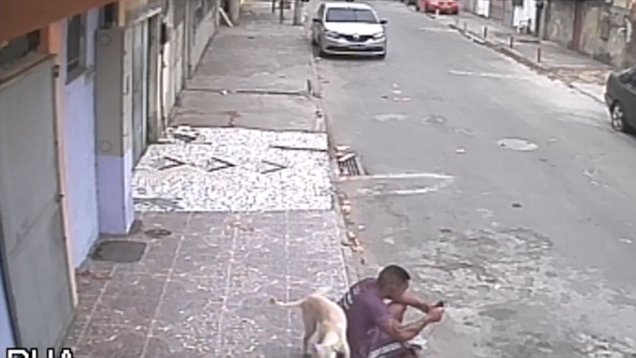 Chú chó đánh dấu lãnh thổ bằng nước tiểu ở ngay lưng người đàn ông đang ngồi vỉa hè. Người đàn ông giận dữ tung cú đá về phía con có nhưng không thành. Sự việc xảy ra ngày 13.10 tại thành phố Rio de Janeiro, Brazil.