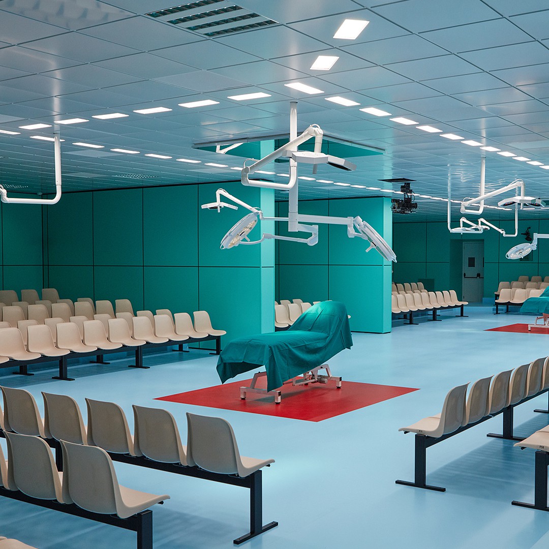 Bối cảnh chính của cuộc trình diễn được sắp đặt như một phòng phẫu thuật.