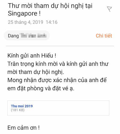 Nguyễn Hiếu, Phó giám đốc một công ty tại Hà Nội, nhận được email với nội dung mời tham dự hội nghị ở nước ngoài. "Công việc của tôi cũng hay nhận được lời mời tương tự, đặc biệt trong email này nêu đích danh tên mình", anh cho biết. "Tuy nhiên email không giới thiệu người gửi từ đâu, nội dung thiếu rõ ràng nên tôi nghi ngờ".