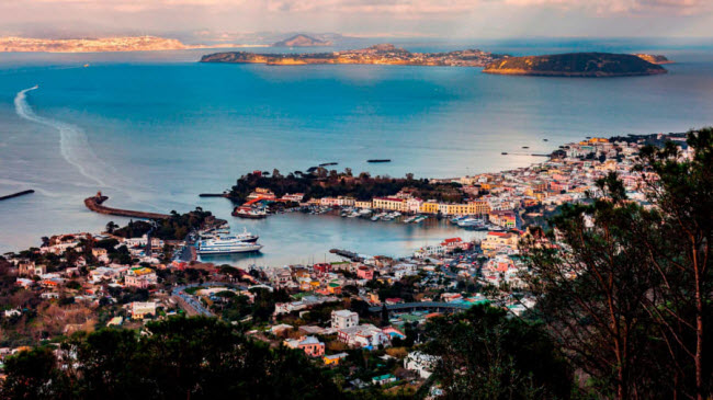 Những chiếc tàu tập trung tại bến cảng trên đảo núi lửa Ischia ở thành phố Naples, Italia.