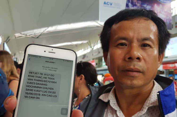 Ông Hồ Thanh Long (50 tuổi) mua vé từ Đà Nẵng về TP HCM lúc 16h45 ngày 15/6. Tuy nhiên đến khoảng 12h thì ông nhận được tin nhắn đổi giờ đến 23h55. Không thể chờ đợi, ông đến quầy tại sân bay để đổi vé song "đứng một tiếng vẫn chưa được giải quyết".