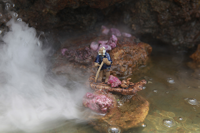 Trong non bộ được lắp ráp máy bơm nước và máy tạo khói để người xem cảm nhận xung quanh mặt nước có một lớp sương mờ ảo