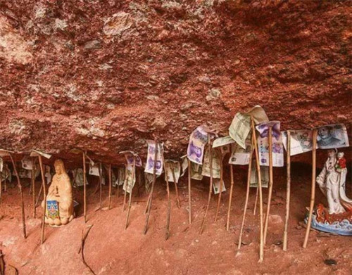 Những du khách nước ngoài lần đầu đến nơi này đều thắc mắc tiền nhiều như vậy mà sao không có ai lấy cả. Hầu hết những người đến chân núi này đều là người sùng đạo, có một ngôi chùa với bức tượng phật rất to được xây dựng sát vách núi.