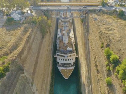 Đoạn phim đáng kinh ngạc khiến người xem có những giây phút hồi hộp khi chứng kiến khoảnh khắc một tàu du lịch khổng lồ vượt xuyên qua vi trí thắt eo siêu hẹp của một kênh đào ở Hy Lạp thành công.