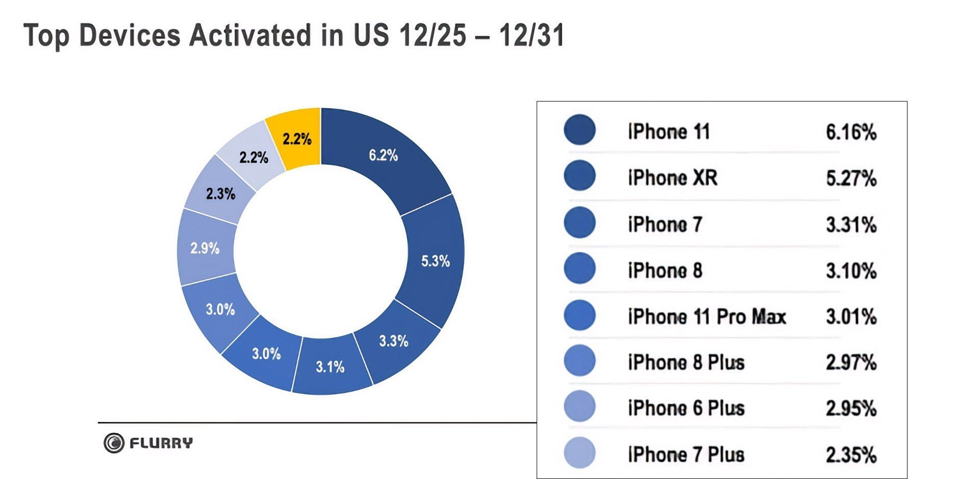 Báo cáo từ Flurry Analytics, Apple tiếp tục giành chiến thắng trong mùa quà tặng và kỳ nghỉ với iPhone 11, iPhone 11 Pro, iPhone 11 Pro Max cùng các phiên bản iPhone cũ.