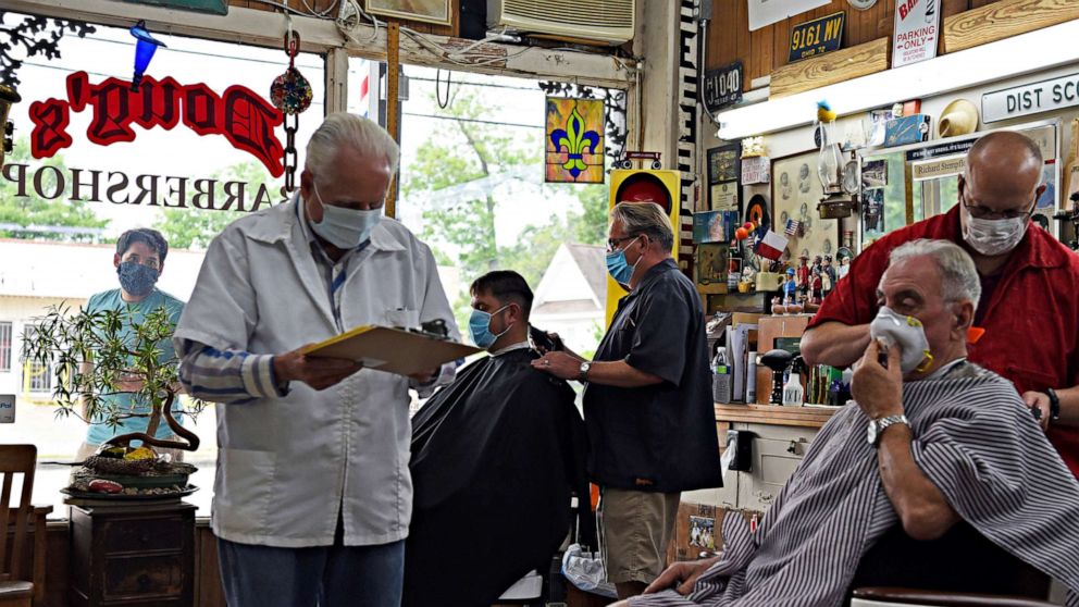 Men receive haircuts as social distancing guidelines to curb the spread of the coronavirus disease (COVID-19) are relaxed at Doug's Barber Shop in Houston, Texas, May 8, 2020.Men receive haircuts as social distancing guidelines to curb the spread of the coronavirus disease (COVID-19) are relaxed at Doug's Barber Shop in Houston, Texas, May 8, 2020.