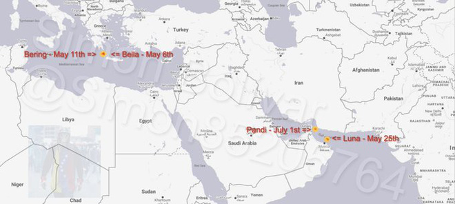Vị trí tương đối của 4 tàu chở nhiên liệu Luna, Panda, BeringBella vào tháng 5 và tháng 7 năm 2020 (Nguồn: Twitter).