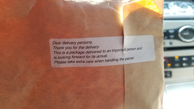 Mảnh giấy đính kèm gói hàng ở Nhật: “Gửi shipper, cảm ơn bạn vì đã giao hàng. Đây là gói bưu kiện được gửi đến một người rất quan trọng. Xin hãy thật thận trọng khi giao nó!”