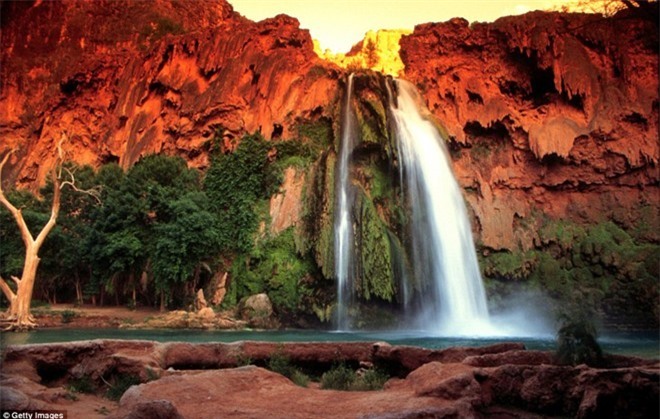 Thác nước Havasu chảy thành hai dòng khi đổ xuống hồ nước phía dưới. Nguồn nước ngọt của dòng thác phủ xanh lớp đất đá sẫm màu của hẻm núi vĩ đại nhất hành tinh.
