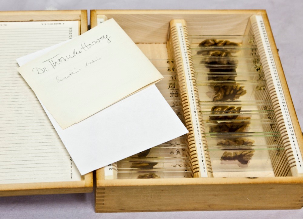 Trong số bộ sưu tập phong phú, có một thứ trông giống như những sợi tảo bẹ, hoặc những mảnh vỏ cây. Nhưng thực tế, chúng có chứa những mảnh ghép từ bộ não của nhà khoa học nổi tiếng nhất thế kỷ XX: Albert Einstein.