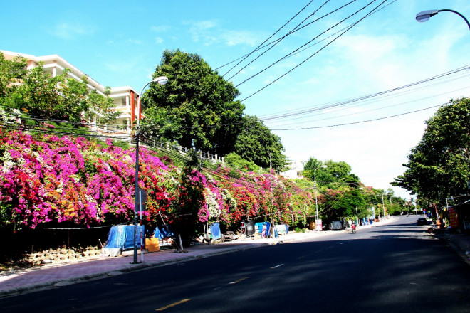 Thảm hoa giấy 5 màu đang bung nở dịu dàng khiến người qua lại phải dừng chân ngắm nhìn. Nha Trang trồng nhiều hoa giấy, có lẽ do khí hậu nắng mưa của thành phố biển hợp với loài hoa chịu nắng này. Nha Trang có con đường Bạch Thái Bưởi nằm ở xã Phước Đồng, ven sông Quán Trường chỉ hơn 200m mà có tới gần 30 cây hoa giấy làm vòm che, đến mùa nắng rực rỡ sắc màu.