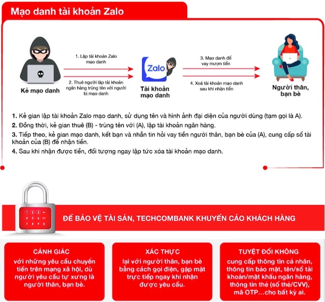 Theo đó, Techcombank khuyến cáo khách hàng nâng cao cảnh giác trước hình thức lừa đảo đang gia tăng mạnh qua ứng dụng Zalo.
