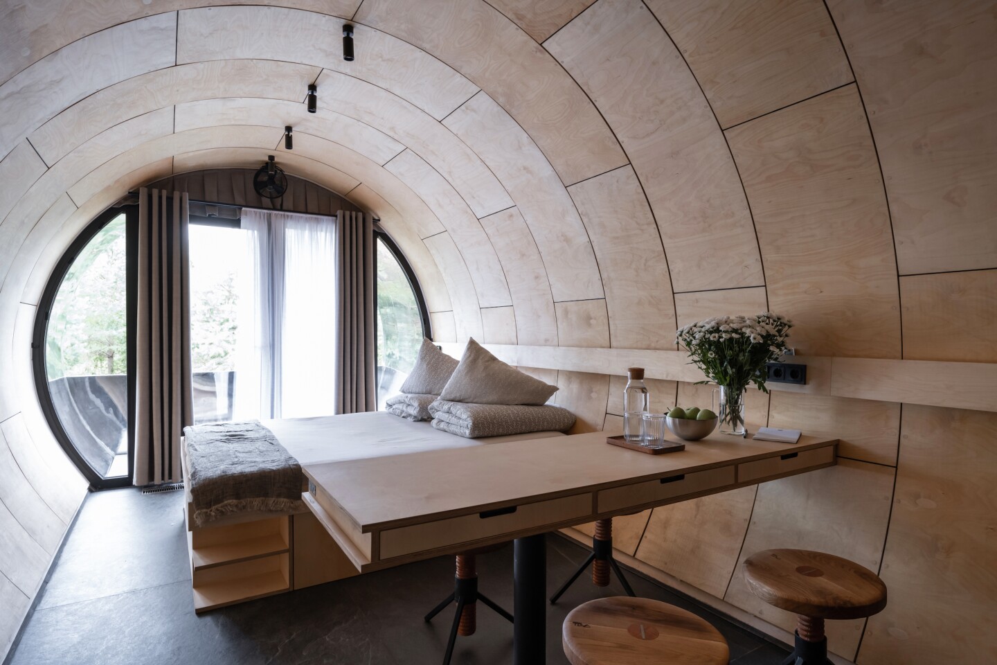 Lớp bọc ngoài phản chiếu là tấm thép không gỉ. Toàn bộ mặt bằng nội thất được bố trí trên một tầng, bao gồm một khu vực ban công nhỏ gọn cũng như một phòng tắm với vòi hoa sen và nhà vệ sinh. Nó cũng có một bếp nhỏ đơn giản với lò vi sóng, tủ và bồn rửa. Ngoài ra còn có một giường đôi tích hợp và một bàn làm việc gần đó. Lối vào nhà là một cánh cửa kính ở phía đối diện với ban công.