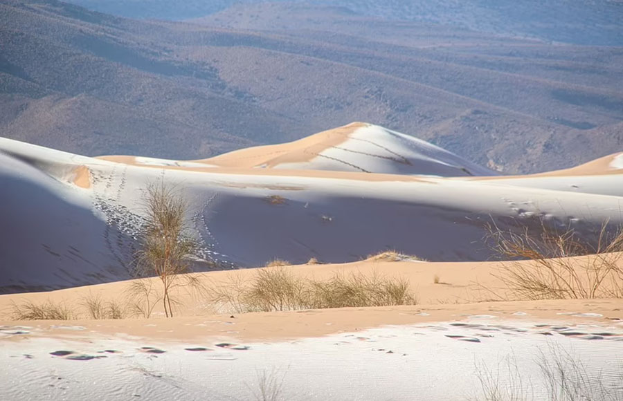 Tuyết rơi, băng phủ trên các cồn cát là một hiện tượng hiếm gặp ở sa mạc lớn nhất thế giới – Sahara, nơi luôn có nhiệt độ cao lên tới 58 độ C.
