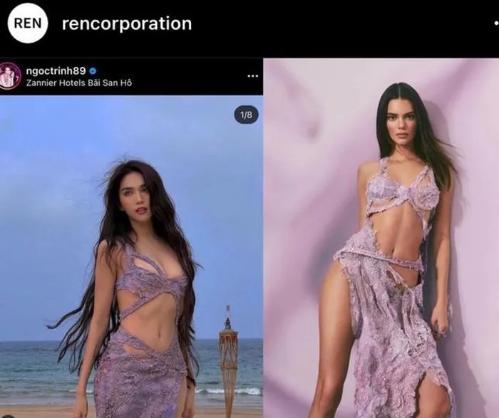 Khoảng đầu tháng 4, Ngọc Trinh đăng tải khoảnh khắc xinh đẹp trên bờ biển với chiếc đầm tím cut-out táo bạo, khoe khéo thân hình quyến rũ, thon gọn. Tuy nhiên, không lâu sau, người đẹp bị một thương hiệu nước ngoài tố đạo nhái thiết kế của brand.